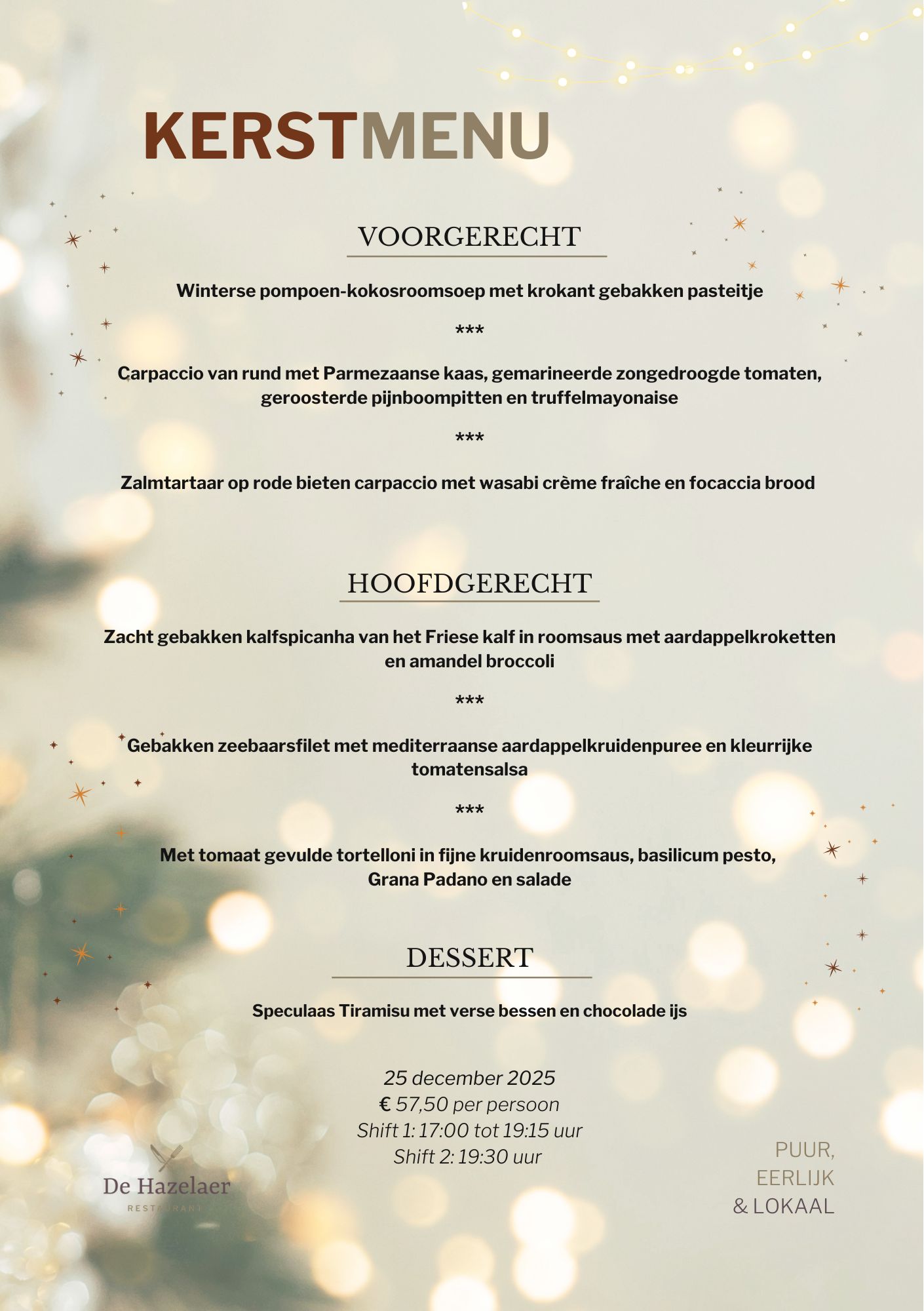Lichtjes in de bomen, kaarsjes op tafel, feestelijke versiering in stijl: de kerstperiode bij restaurant De Hazelaer betekent volop genieten van al het moois wat deze tijd van het jaar te bieden heeft. Warmte, sfeer en gezelligheid voeren de boventoon. Met als extra accent het kerstmenu welke wij op eerste kerstdag in ons restaurant serveren. Op tweede kerstdag serveren wij a la carte.